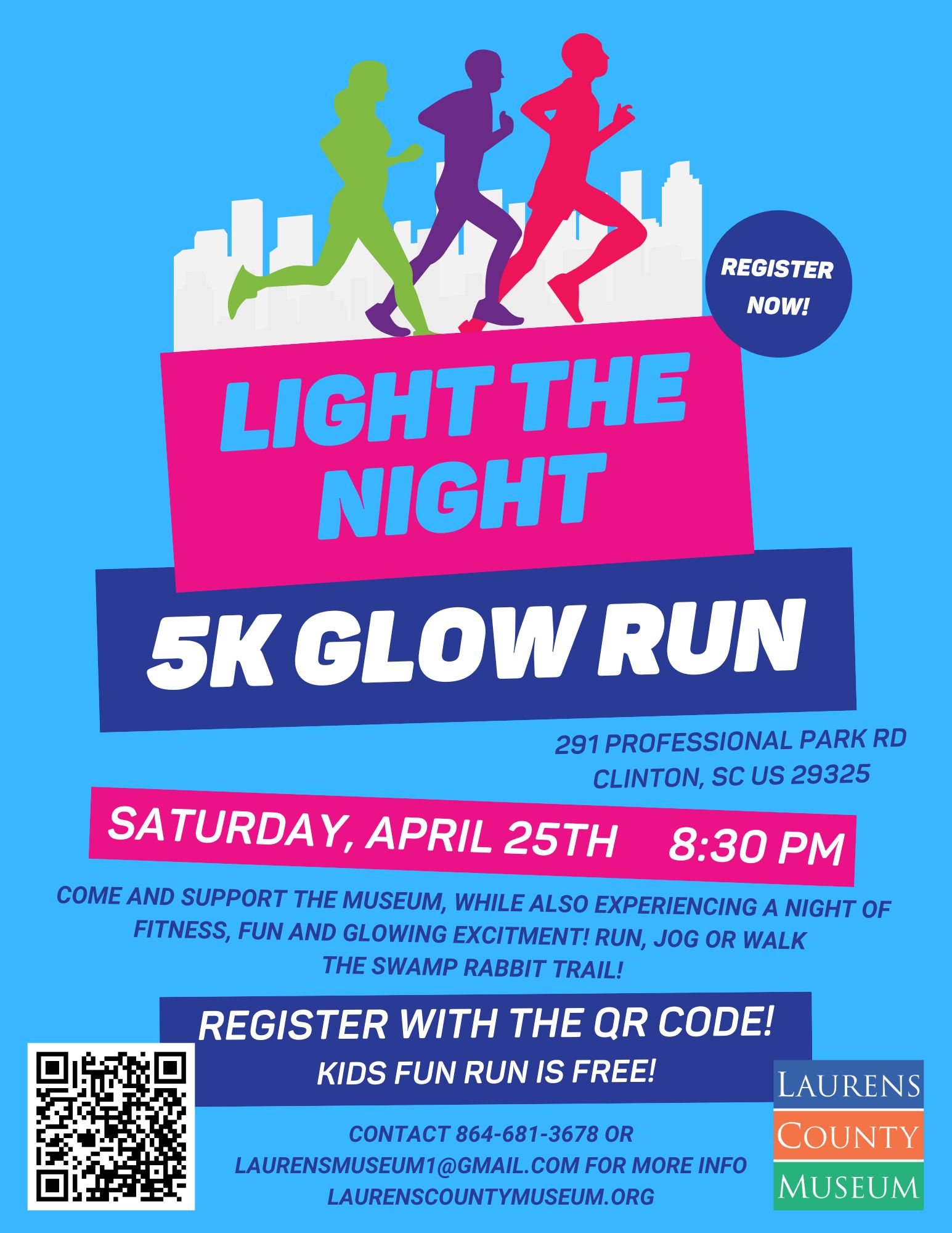 Held at the Swamp Rabbit Trail at the Laurens Chamber of Commerce, this fun evening event invites participants to run, jog, or walk the trail in support of the museum. A Kids 1-Mile Fun Run will also be included.