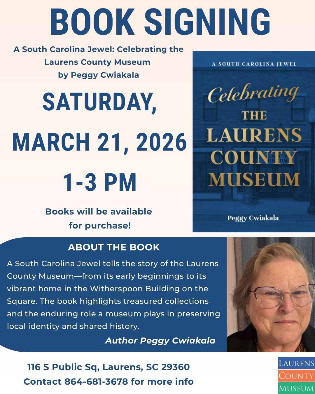 Peggy Cwiakala has released her new book, A South Carolina Jewel: Celebrating the Laurens County Museum.