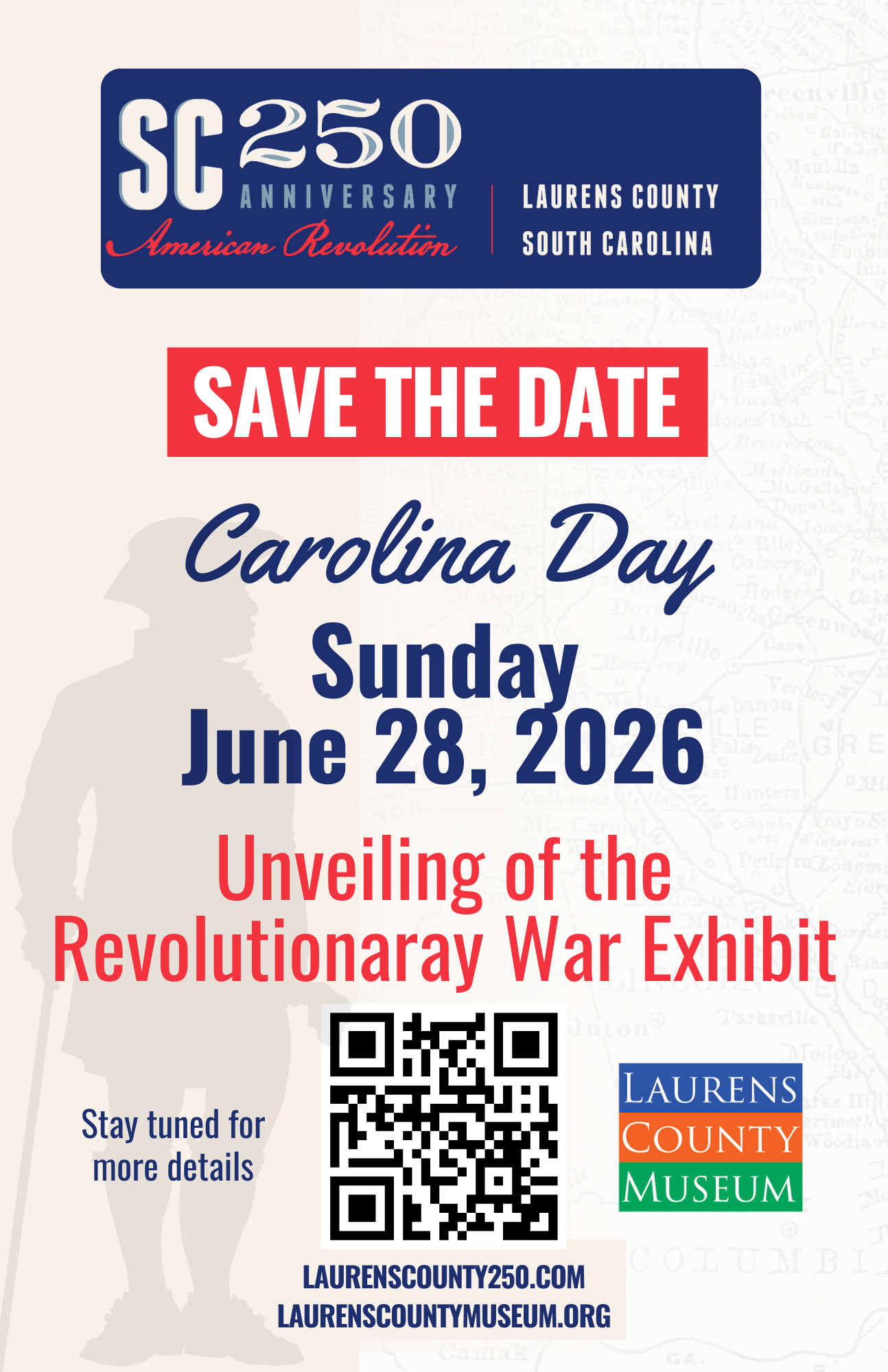 Carolina Day, June 28, 2026. We will have a full afternoon of activities and the unveiling of the new Revolutionary War exhibit. This exhibit is made possible by a large grant from the SC 250 Committee. It will be spectacular!